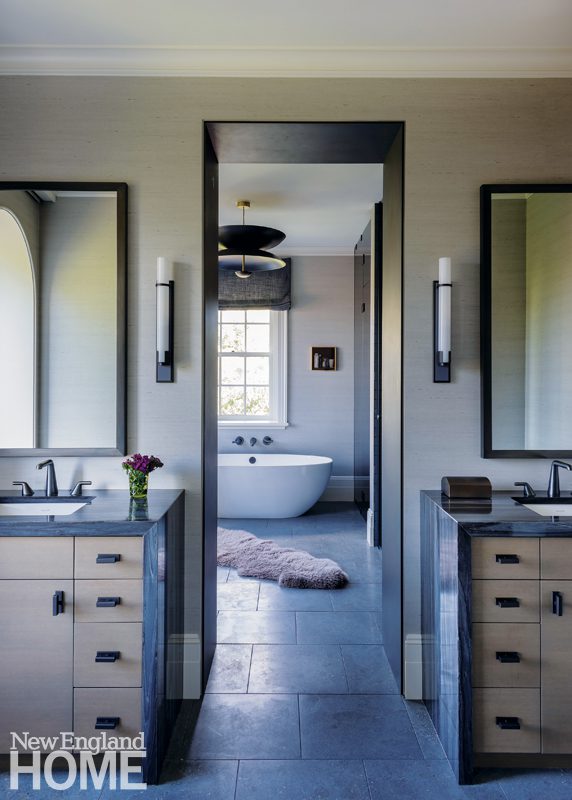 In the living room, Elms elected to emphasize the striking arched windows by forgoing treatments, and in the primary bath, she chose to clad the portal that leads from the vanities to the bathing area with three-quarter-inch steel, making two separate spaces feel cohesive.