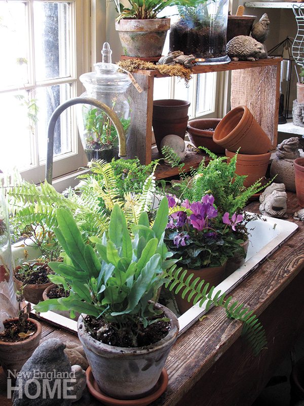 Inside the shop, a charming 1850s farmhouse, bright blue watering cans stood silhouetted against white enamel dishware. One-of-a-kind terrariums surrounded a porcelain sink. A wall of mirrors reflected the olio of carefully curated natural objects. Bursts of plants were everywhere. By the time we left, the sun shone as if it were a spring day.