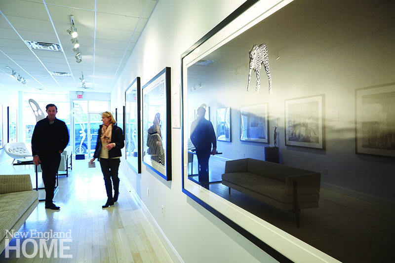 A new Greenwich original, Putnam & Mason is located (as its name implies) a few doors down from the intersection of those two streets. The showroom, a partnership between New York designers Kim Alessi and Robert Passal, stands out for its sophisticated urban aesthetic. One of the two is always in the store; today it is Alessi, and she’s with a client—giving us a moment to explore P&M’s mix of vintage objects, contemporary furniture, and fresh artwork arranged casually to evoke a cosmopolitan pied-à-terre. “The concept is to create a living environment in the space,” Alessi explains. “It’s not just a shop, it’s a lifestyle.” Don’t get too comfortable, though—pieces sell regularly, necessitating frequent restaging. What doesn’t change (at least not yet) is the showroom’s deep-blue walls and its powder room, memorable for its mirrored molding, vintage French mirror, and elegant Schumacher wallpaper. Also in the rear of the store is a “sample bar,” designed by kitchen design partner Chuck Wheelock, where clients can spread out wallcoverings, fabric, and floor samples from Brett Designs, Phillip Jeffries, Cowtan and Tout, and others.