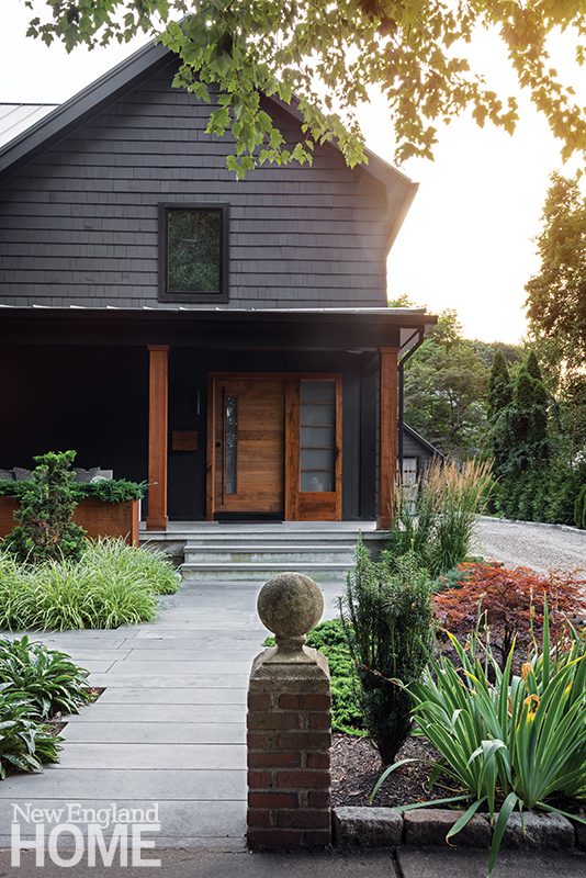 He immediately decided the two existing buildings, the house and a garage with screened porch, had to be connected. The resulting structure contains a mudroom, kitchen, and dining area. It all adds up to a crisp modern farmhouse infused with Boronkay’s aesthetic: a tone-on-tone black-clad exterior and clean-lined interiors he describes as “a little bit Zen and a little bit glam.”
