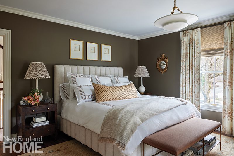 For the window coverings, Gates worked with Manny Makkas of Makkas Workroom to select a gray linen drape. They kept treatments straightforward throughout to highlight the home’s character and charm. Makkas’s favorite: a simple lined café curtain beside the soaking tub in the primary bath. “My primary bathroom is one of those spaces I didn’t hold back on,” says Gates, who designed custom vanities with New England Artisan Restoration to look like antique chests.
