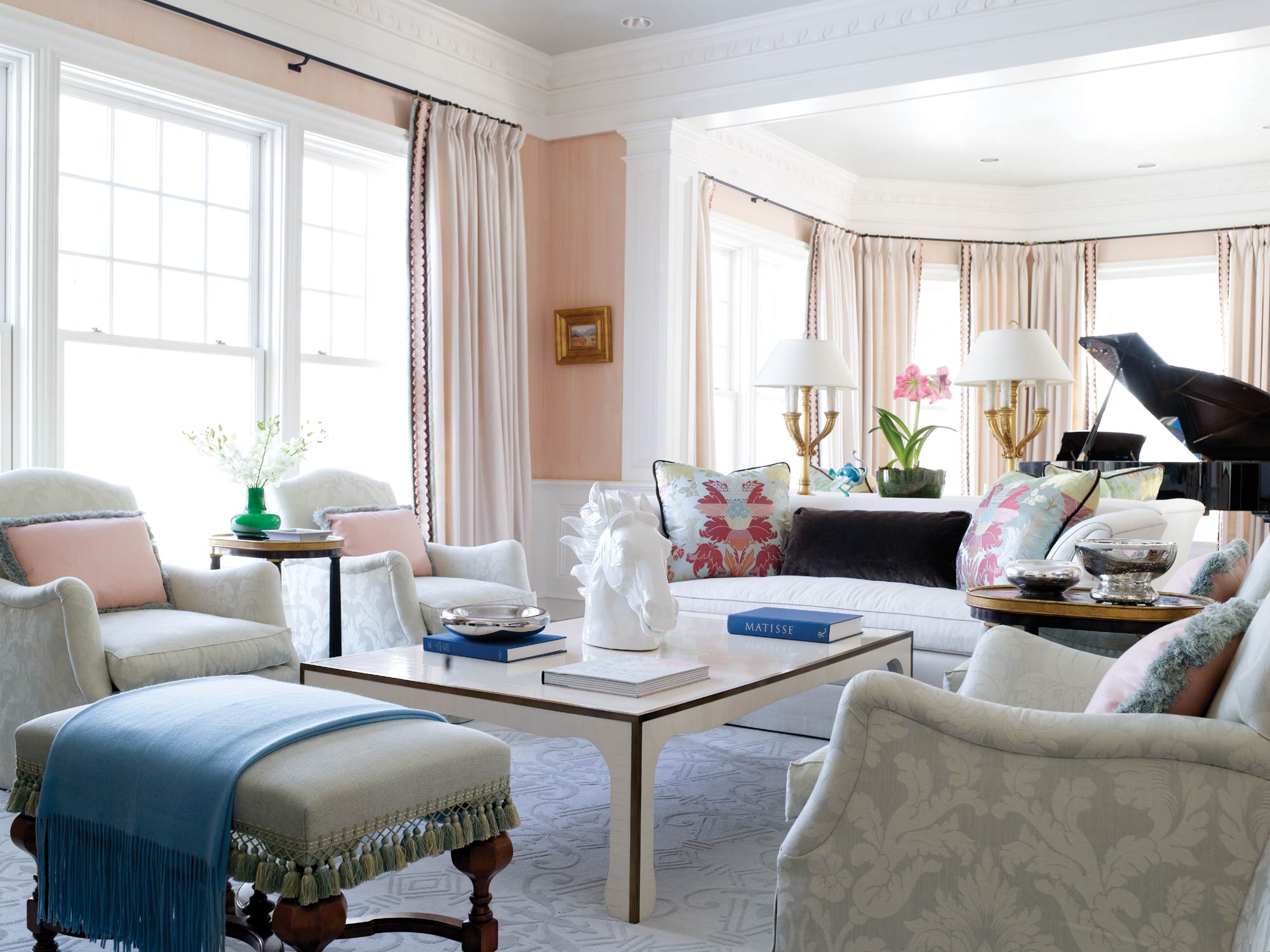 The striéd, salmon-glazed walls of the living room echo the chairs backed with pink silk-velvet in the adjacent dining room. (The family arrived with only eight chairs but the designer wanted ten around the table, so she had two replicated to match the originals.) Chocolate-brown lacquered walls, a French-deco, rock-crystal chandelier and a large mercury-shaded mirror add a dose of drama. “There are certainly elements of the traditional in this room, but it’s not over-the-top traditionalism,” says the designer.