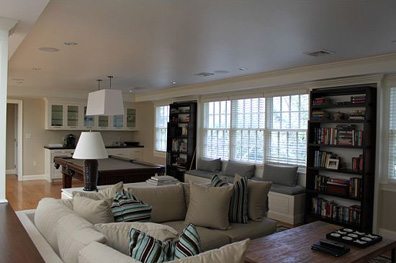 Susan added a cocktail table crafted from reclaimed wood to the sleek, contemporary furniture in this media/billiard room in a Wellesley, Massachusetts, house. “It takes all the fuss out of eating pizza and beer,” she says. “Spills on the table are added patina.”