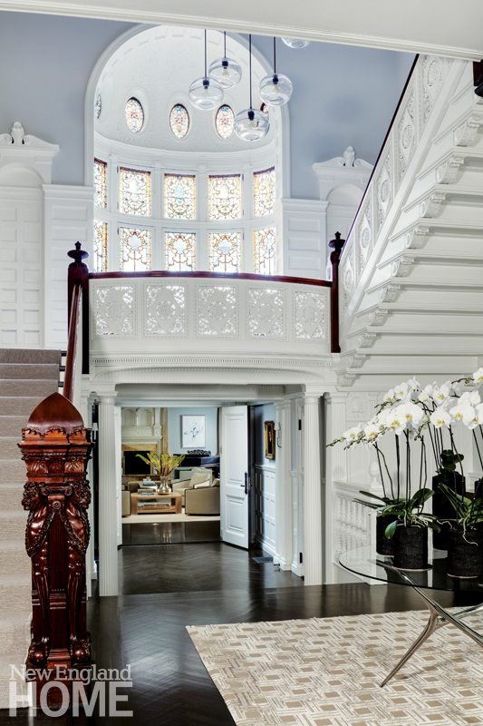 “The house is really large but there are numerous small spaces that feel intimate and welcoming, niches like this one by the main staircase that aren’t overwhelming,” Barbara says. The pieces she chose have a simplicity, even as they celebrate classic shapes and materials. “A small abstract piece of art feels like a good juxtaposition to the more traditional other elements in this space,” she says. We especially like the choice of reading material in the magazine basket beneath the table.
