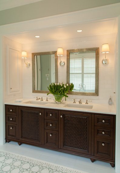 “In the master bath we went for the ‘Ango Indian’ look with a vanity I designed to create an island-like retreat,” explains Barbara. “Crisp white tile and silver sconces and mirrors keep the look really tailored and easy on the eyes.”