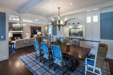 With its pristine white wainscoting and ceiling beam the dining room has lots of classic elements, but the bright blue gives it a fresh vibe. “A mix of bright color/pattern and rustic finishes make this room casual and lively,” she notes. “Not a formal dining room but a few steps up from the ‘picnic table at the beach’ look.”