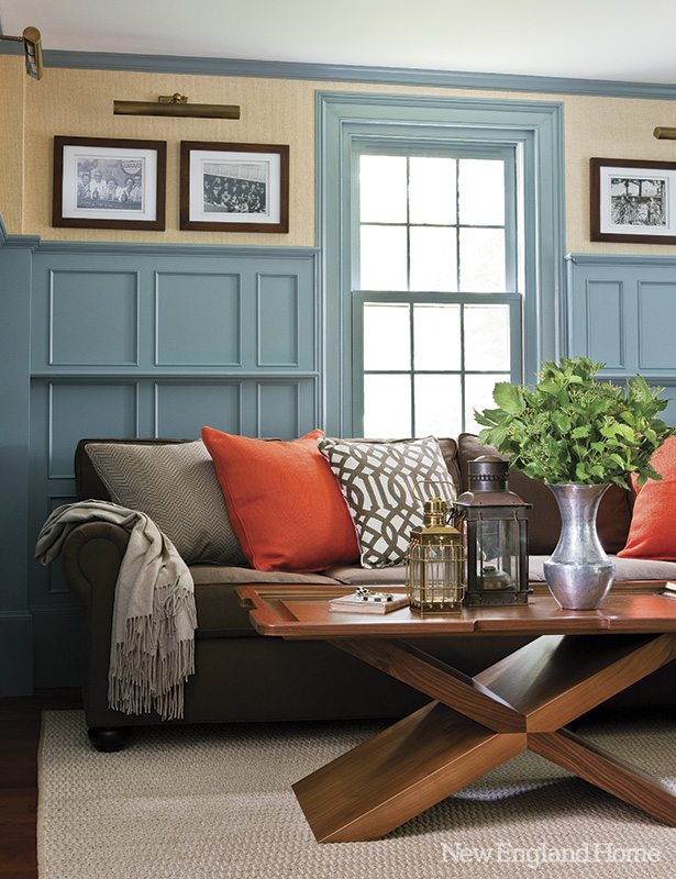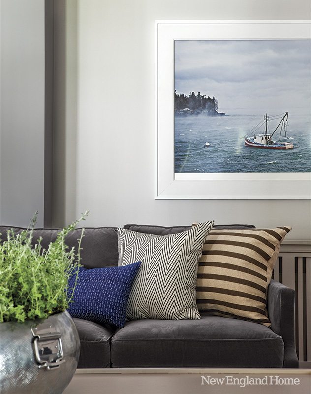 At the rear of the classically proportioned house, the kitchen flows into the dining room, living room and Greg’s home office. Meier’s eclectic sensibility is evident throughout. Greg’s work desk, for example, is a glass tabletop resting on chrome sawhorses. The dining room sideboard had a previous life as a store’s checkout counter; Meier dressed it up with an elegant marble top. The diverse mix continues in a blue-paneled den, where traditional architectural elements and furniture meet a Meier-designed coffee table on a modern X base. “Greg wanted a cozy, cozy room,” Meier says. Above the paneling, framed photographs of Rockport Lodge vacationers hang on walls softened with grasscloth.