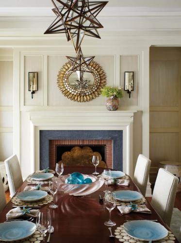 Step inside, and the careful attention to detail changes this house from simple to something special. The design of the staircase newel post is fashioned after the binnacle of a sailboat, in homage to the harbor outside. Hidden behind a curved paneled wall underneath the landing is a small powder room complete with a hammered brass sink. (This same brass is echoed in the inserts in a pair of cherry tables in the living room and lamps in the master bedroom.) Looking through an interior window, the twin star light fixtures above the dining table are seen repeated as smaller versions in the family room. Coffered ceilings in the living room boast a delicate roping detail, another nod to being on the water.