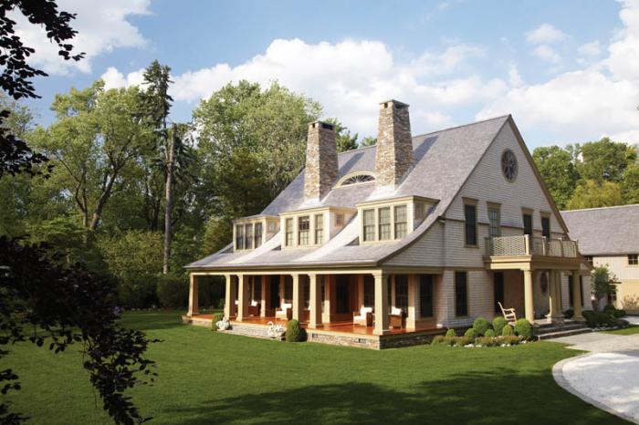 From a distance, it’s a simple stone and shingle house with a bevy of large, unadorned windows and an ample porch overlooking Noroton Harbor. Though it has an expansive green lawn, the house itself seems content nestled back within the protecting shadows of wizened trees.