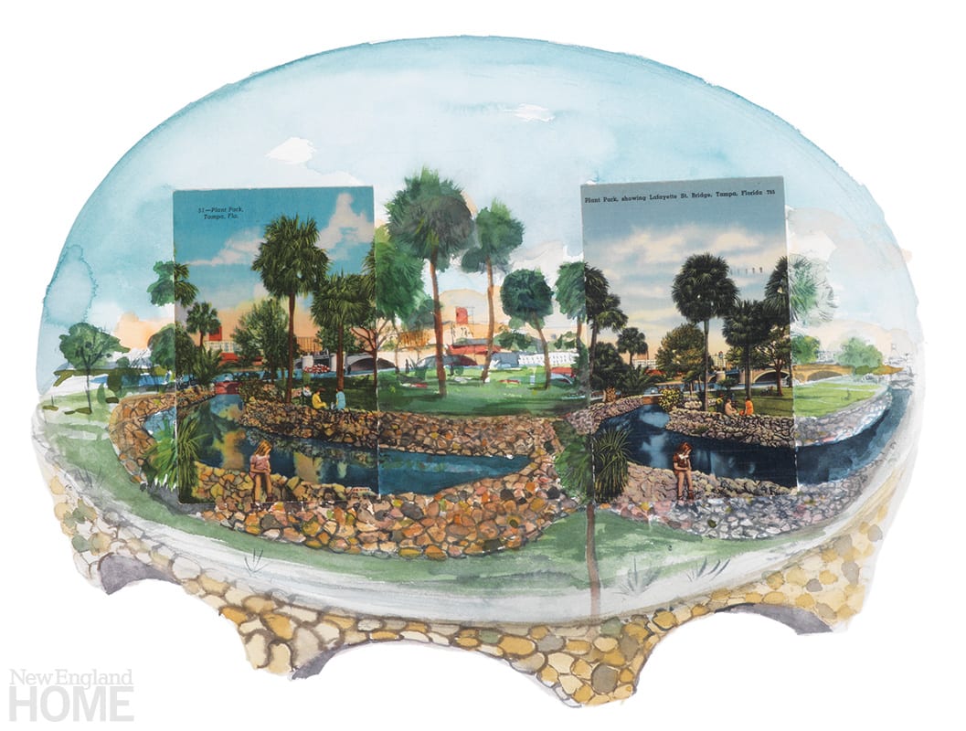 As Wegman shows off the cavernous, 10,000-square-foot former lodge that he calls home every summer, he points out several paintings that he describes as “works in progress” in his spacious, light-filled first-floor studio, formerly the lodge’s kitchen. The large-scale, colorful, collage-like works feature vintage postcards; Wegman uses them as a starting point, painting around them to incorporate them into a scene. “I love prowling through Maine to find these lovely old postcards,” he says. Painting, he reveals, is his first love and the reason he went to the Massachusetts College of Art in 1965 and earned an MFA from the University of Illinois in 1967.