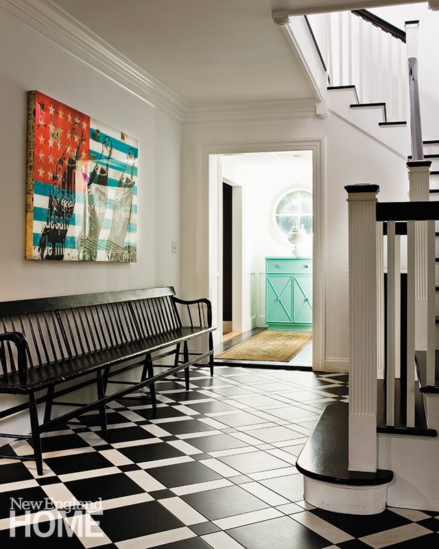 Floor-to-ceiling cabinets act as smart as they look, hiding all manner of twin trappings such as coats, backpacks, and sports equipment. A long deacon’s bench sits opposite the original staircase, which was lovingly restored. A new marble top was fabricated for an antique cabinet, while another custom piece was painted Tiffany blue.