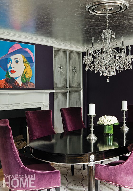 A custom carpet of wool and silk grounds an antique dining table that was transformed by black and silver paint. The chairs were covered in velvet to match the walls and accented with nail-head trim. A classic, colorful Warhol hangs over the mantel.