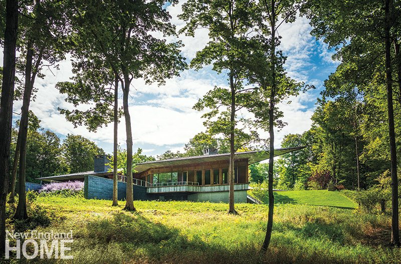 Dynamic, soaring roof projections lend a theatrical note to a sleek contemporary house tucked into a Vermont hillside.