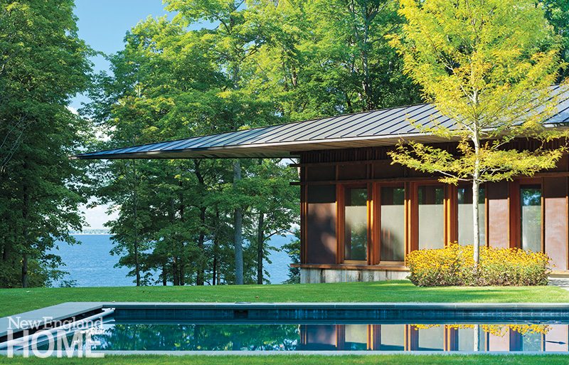 The drama begins at the top, where the roof juts out eight feet beyond the exterior walls. Mac gave that striking design element a further touch of the theatrical by adding twenty-eight-foot cantilevered roof forms on both the main house and the garage wing. The two forms pack a visual punch and act as a sort of picture frame for the views of the shoreline and north up the lake to Burlington, Vermont. “Whether you’re inside the house or in the courtyard,” notes Mac, “you always feel the presence of the architecture in the landscape.”