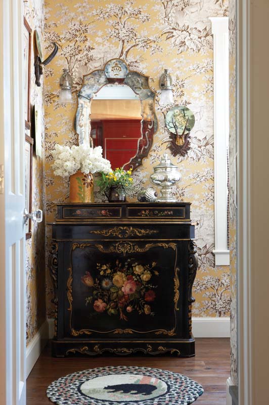 Wendy Valliere has never been one for drama in her life. Her interiors—well, that’s another story. She loves bold patterns and colors, red- and black-lacquered woods, even flocked paper on walls and ceilings. Her 1842 farmhouse in the heart of Stowe, Vermont, is color-saturated, pattern-packed and filled with antiques and art, playing out her favorite design themes.