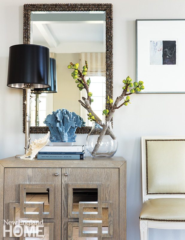 In the living/dining room, Amsterdam chairs by Hickory Chair, painted an antique ivory finish, surround a classic English-style mahogany table (a nod to Dominic’s more refined aesthetic), while a mirrored limed-oak cabinet that stashes the TV evokes midcentury modern American design and speaks to Christopher’s more contemporary leanings. Above the cabinet, Acevedo hung a mirror with a button-shell frame to give the room a spacious feel.