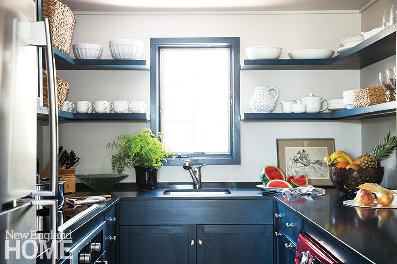 The streamlined aesthetic that defines the small sitting area carries into the galley kitchen. Acevedo relied on open shelving and symmetry for a sense of space; slate-gray granite countertops and cabinets painted Farrow & Ball’s Stiffkey Blue lend depth and conjure the sea at night. Proof that every square inch is utilized in the user-friendly space: the washer/dryer (note the pop of red) is also tucked under the counter.
