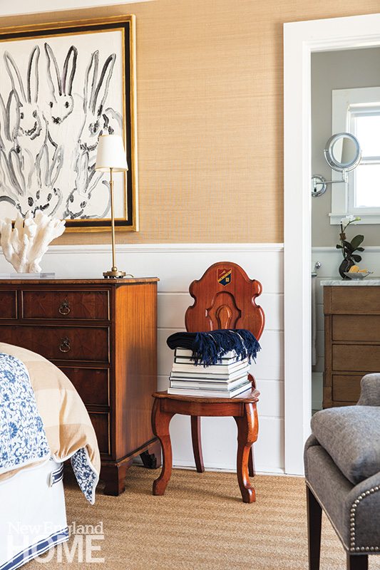 Given the tight dimensions, Acevedo reasoned the guest room needed a punch of color in the form of a custom duvet in Rogers & Goffigon fabrics. He found two “super skinny” antique French faux-bamboo nightstands that just fit, and opted for sconces to free up valuable tabletop space for books and treasures. Nine small, square paintings mounted in a grid pattern depict the shoreline and sky, a nod to the coastal paradise that lies just outside the window.