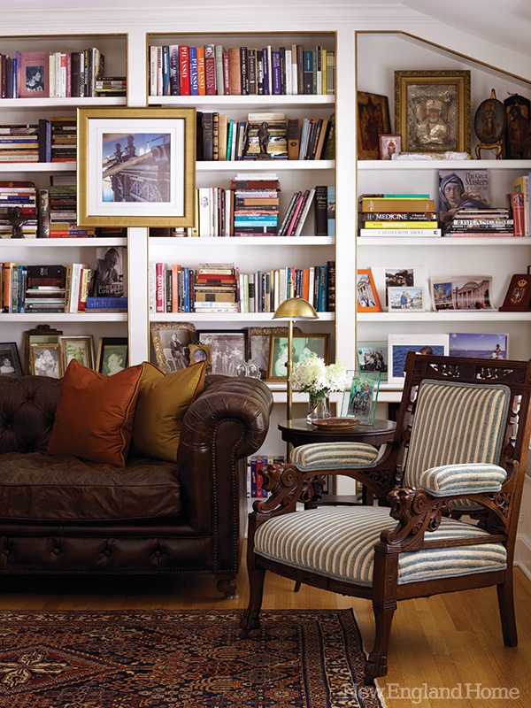 Winer-Sorensen gave the study and library a more traditional look, hanging lush curtains of gold silk on fluted wood rods to complement the cocoa-brown walls and gold-leafed ceiling. She chose a First Empire mahogany table for a desk, pairing it with a modernist cognac-colored leather chair and an antique escabeau that acts as a bookcase. Overflowing with books and family photographs, the room is cozy but not cluttered. It has a timeless, Old World feel with its big Chesterfield leather sofa and an ornately carved nineteenth-century English walnut chair.