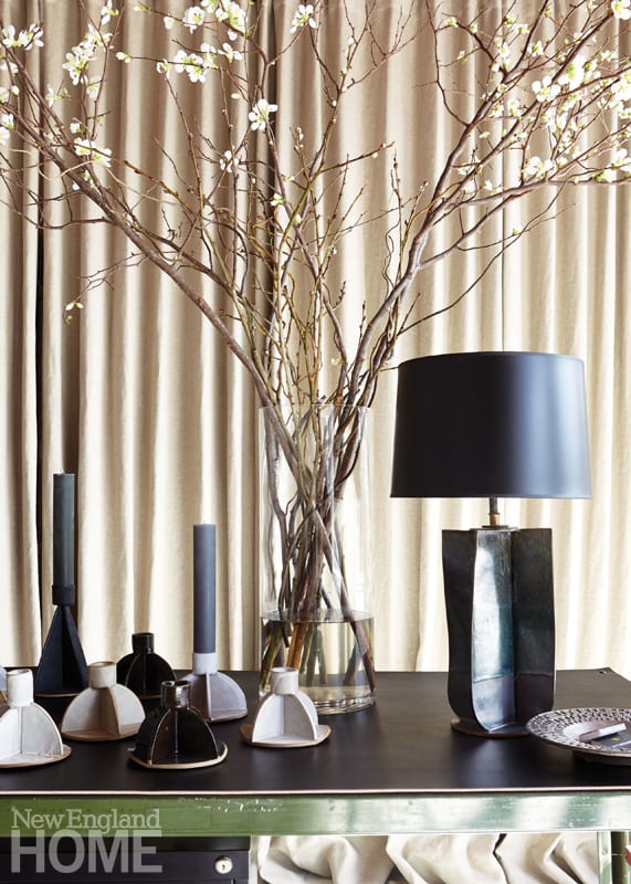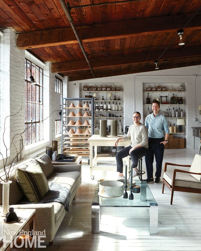 Both men still hold down day jobs (Kevin owns Dumais Interior Design, and Charlie is a principal at BOLD lighting design). They spend three days a week in Manhattan and four in Connecticut, working in a spacious studio that’s filled with natural light and uncommonly neat. There’s the clay side, with Charlie’s tools, tables, sink, kiln, and shelving (“I finally got a slab press,” he says, “and I think the first time I used it, I cried.”). There’s Kevin’s side, from which he also manages his interior design practice. In between is an inviting, midcentury-inspired sitting area.