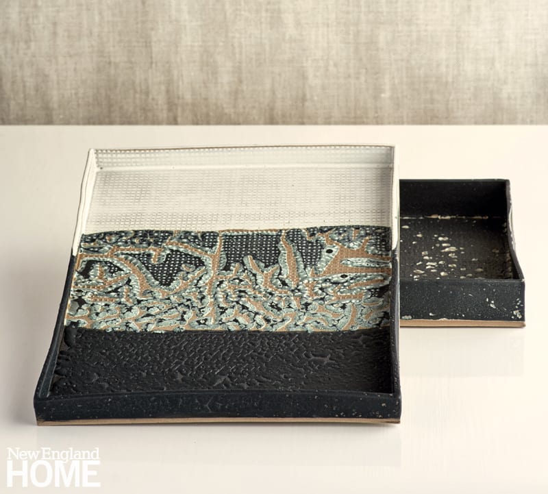 Soon, he was making one-of-a-kind lamps, “a little rugged, with texture. I like them to feel architectural,” he says. At first, most were rectilinear, and then gradually he added curves, built a cylinder, and using an old Danish rolling pin, created a waffle-like texture. In time, candleholders, trays, and vases joined the mix.