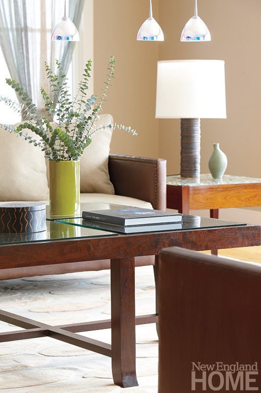 Here and throughout the first floor, the palette is soft and earthy, a blend of chocolate brown, coppers and beiges enlivened with light blues inspired by a painting of a sailboat the owners already had that now hangs in the sitting room.