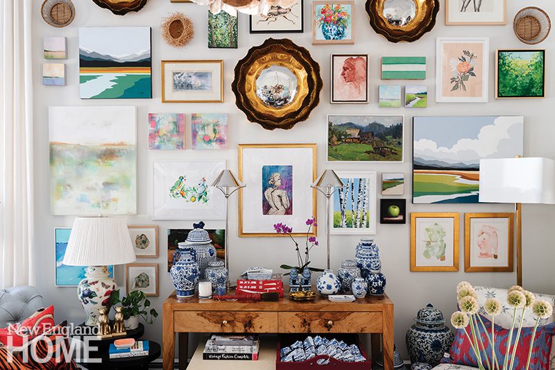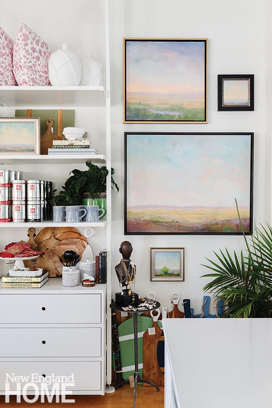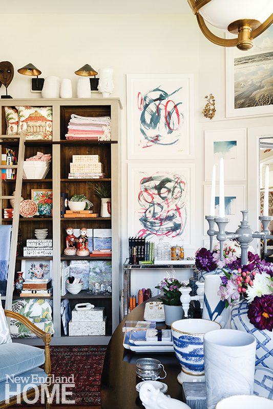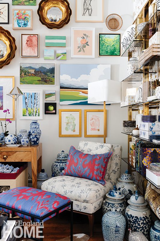 Finally, there are the in-the-know design afficionados, the ones who travel to Chestnut Hill only to discover the corner shop behind the plate-glass windows is never quite the same place twice. The linens and accessories that adorn the dining table in the front portion of the space might skew blue-and-white vintage ginger jars one time and candy-colored Dunes and Duchess candlesticks the next. The gallery wall in the living room area, Benedict’s favorite place to play with styling, might spotlight colorful abstracts one season and gilded mirrors the following.
