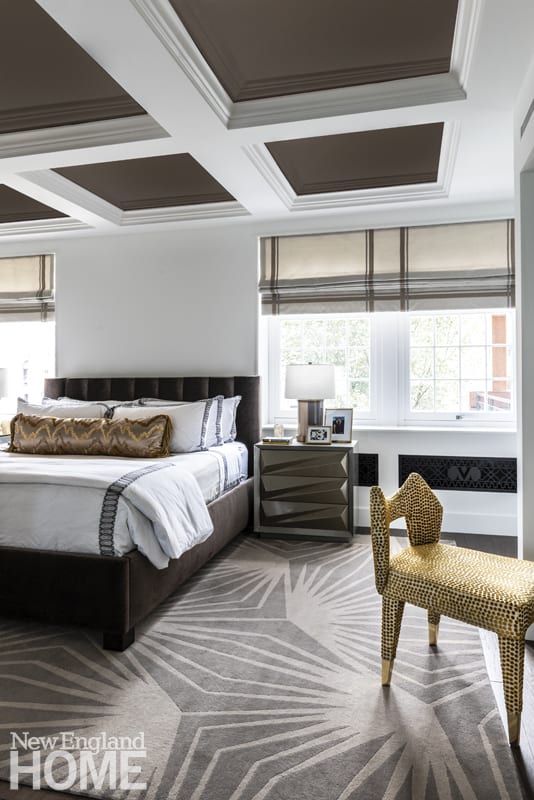 Now when you exit the elevator into the fourth-floor apartment in Maison Vernon, a seven-unit building on Beacon Hill, the first thing to catch your eye is the Sherwin-Williams Copper Mountain stripe down the center of Emilia Fazzalari Grousbeck and Wyc Grousbeck’s dining room ceiling, wall, and window frame. It wasn’t an easy sell for the Houston, Texas-based interior designer—even if she considers Fazzalari Grousbeck one of her best friends.