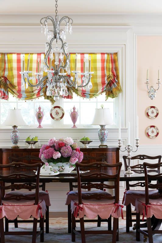 The dining room sits adjacent to the living room, highlighted by an antique mahogany Georgian table. Ribbon-back dining chairs wearing scalloped slip-covered seats gather around the table like girls in party dresses. Dainty Staffordshire plates frame the antique sideboard, which is perfectly set off by the window and its silk balloon shade above. Add some light from the custom chandelier, a bit of glimmer from the sconces and an Aubusson carpet to assure footsteps fall as lightly as snow and the dining room becomes one of those memorable settings guests recall for friends.