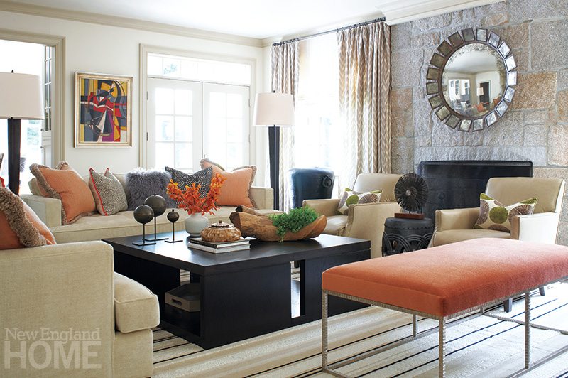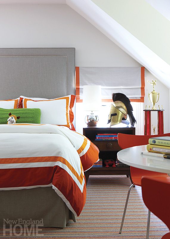 The son’s bedroom has an easygoing masculinity, with pale-gray walls and energetic orange accents. Karlan found a striped carpet (a favorite leitmotif she used in other rooms, too) with orange and grays that are echoed in the upholstered bed and shades. While the nightstands from Hickory Chair are serious pieces of furniture, the wife wanted the room to have a playful aspect; instead of a traditional desk, she chose Ikea’s version of a Saarinen table, then paired it with orange chairs from Crate & Barrel.