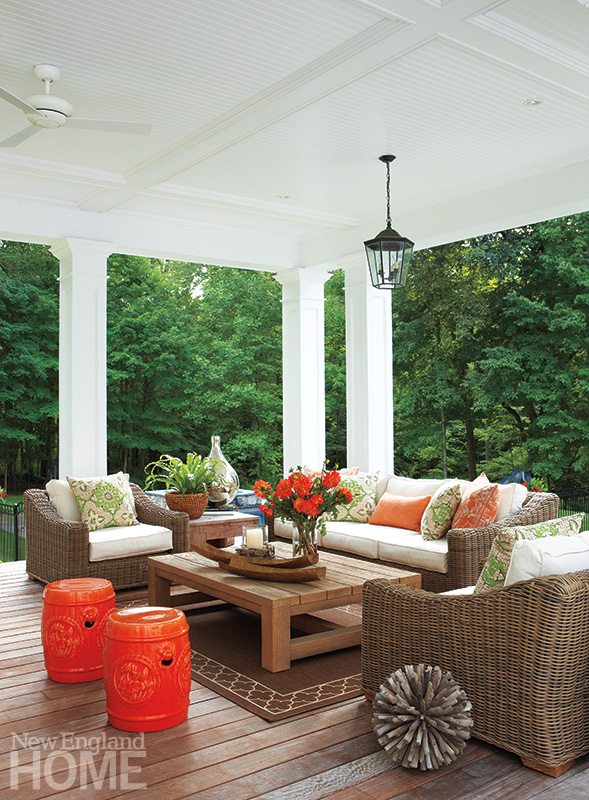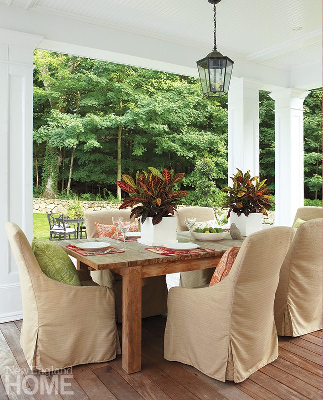 Instead of attaching a porch to the house, which Faloon saw would block the sunlight that streams through the windows over the kitchen sink, he designed a detached outdoor pavilion. Classically detailed to complement the front of the house, the pavilion is elevated but sits close enough to the ground to avoid having railings. “We wanted it to float and have a real sense of openness,” the architect explains. The family practically lives in the pavilion in warm weather. With separate dining and lounging areas, Karlan notes, “It’s not a patio or deck, but a real outdoor room. We furnished it with large, sturdy pieces so they can have a proper dinner party.”