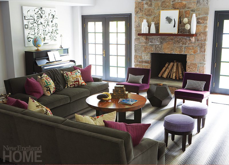 A second family room acts as a super-sophisticated rec room. “It’s a place for my husband and son to do what they like to do best—play video games,” says the wife. Karlan, who has dubbed it the man cave, was asked to incorporate a black upright piano into the room, which prompted her to choose a graphic black-and-white striped carpet along with sofas upholstered in dark gray. Purple side chairs, stools, and throw pillows “add a pop of color that’s good for a nighttime retreat,” say Karlan. There’s also a touch of purple in another Zevon painting that hangs over the games table from Hickory Chair. “That is where my husband hosts his bridge group,” explains the wife.