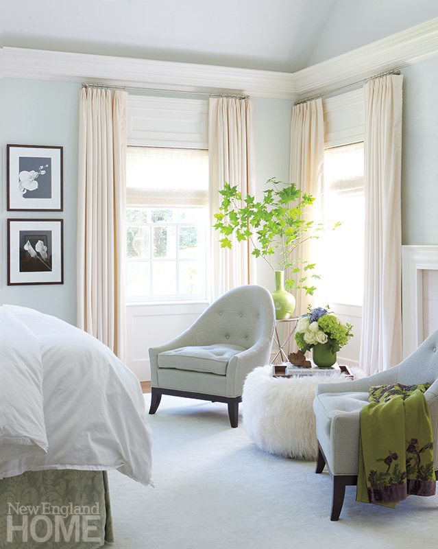 At the end of the day, the couple retires to the master suite, which the wife had painted a soft Donald Kaufman blue before she’d engaged Karlan. “We kept it soothing but not boring,” says Karlan, who designed ivory wool-blend drapes and upholstered a pair of chairs in a slightly iridescent fabric, then placed a luxurious Tibetan wool ottoman between them. “The room has a glamour that is appropriate to the setting,” she says.