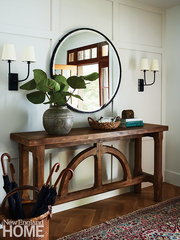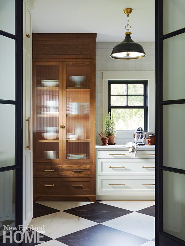 To add some character, she introduced lots of custom cabinetry and millwork to the home, which was designed by Schadler Selnau Associates. “We used shiplap ceilings in the kitchen and family room, and we did board-and-batten in the entry hall and second-floor hallway,” notes builder Peter Sirois of Zel. Gridded-steel doors punctuate the interior, introducing a fresh, industrial counterpoint to the nostalgic architecture and warm white-oak floors.