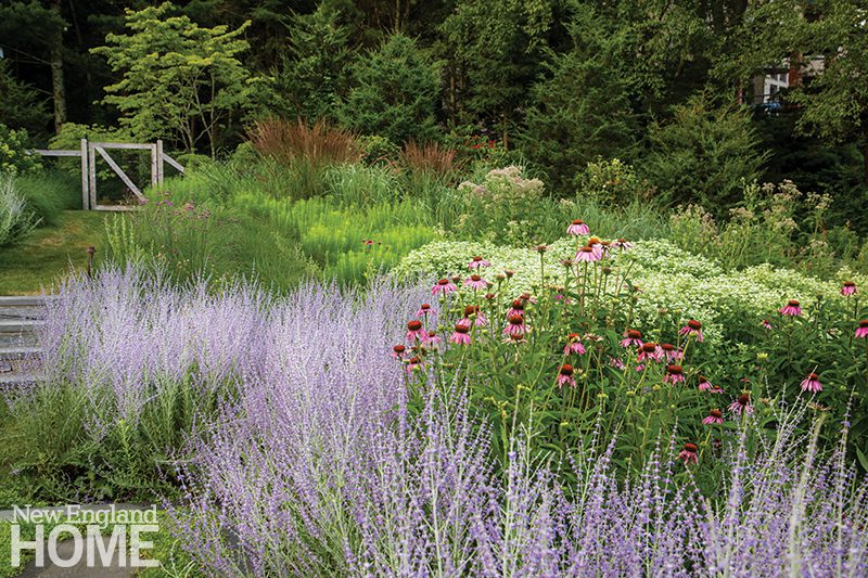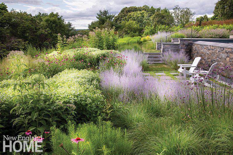 Buffeting it all, naturalistic plantings serve up swaying, pollinator-humming swaths of color. The plantings needed to withstand strong winds, and Noyes selected stalwart Russian sage, ornamental grasses, hydrangeas, joe-pye weed, catmint, and mountain mint to provide year-round beauty. “It’s heaven on Earth, truly,” Foley says.
