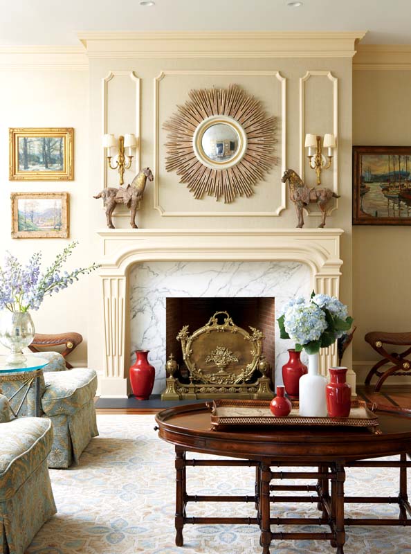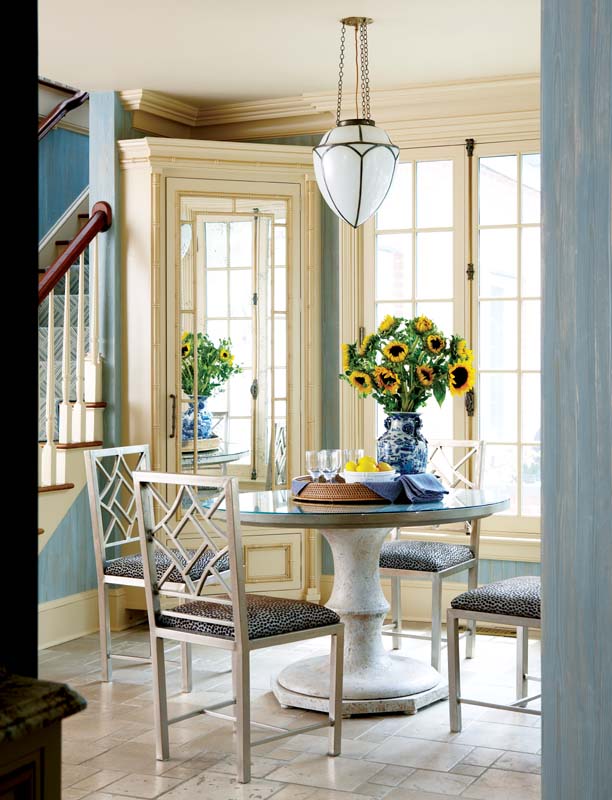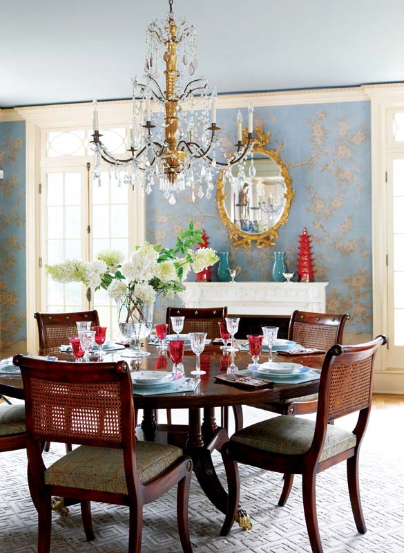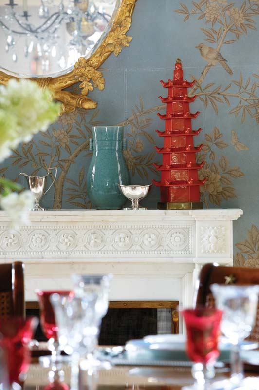 As user-friendly as they are, the interiors are also chic. If mom and dad don formal attire for dinner, they won’t look out of step in the dining room, resplendent with a custom-colored Gracie wallcovering. An antique gilded chandelier dripping crystal prisms is the kind of fixture that inspires toasts. And while guests are admiring its silhouette, they’ll notice the blue-as-sky ceiling. “It’s one-sixth of the room,” says Rinfret. “Never leave a ceiling white.” A set of cheery pagodas—a bit of whimsical chinoiserie—sit atop the marble mantel.