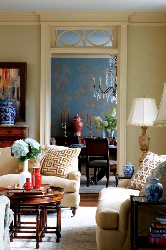 “Cindy has an amazing way with color,” says the happy wife. And if proof of that is needed, she has only to initiate a tour. The sun-drenched rooms—all dreamy blues and beiges—unfold one after another in an appealing scheme that underscores the home’s attributes. Teamed with a barely-blue Kravet wallcovering, for instance, the entry’s creamy paneling gains prominence. And a shimmery Donghia grasscloth catapults the living room’s moldings and fluted mantel to the forefront. Accents of red and coral—like a sweep of rouge on the cheeks—give it all a lively kick.