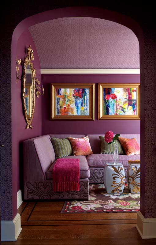 The stunning library, paneled in butternut and sporting a gold ceiling, would do as well for cocktails as it does for reading. Through an open door, a lick of purple appears. “It was such a cool color, we kept it,” says the wife of the sitting room. Rinfret piled on more color, wallpapering the ceiling and designing a luscious sorbet-hued sofa.
