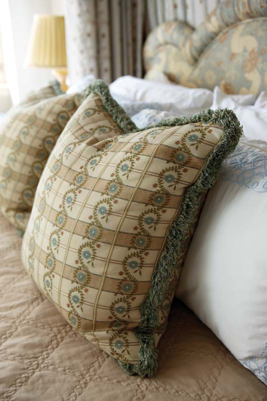 The parents’ Rinfret-designed canopy bed came along from their old home, as did the sweet heirloom settee at its foot. Tiptoe into the wife’s dressing room and the feminine ambience escalates with a pretty wallcovering and a dainty blue chaise. Her bath (the husband has his own across the way) holds a bowfront tub and an antique Venetian mirror.