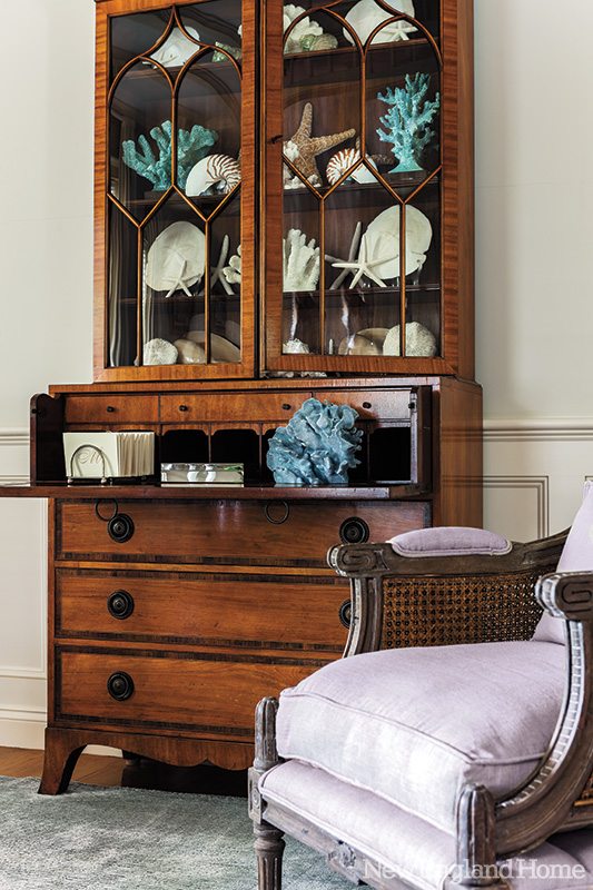 In the living room, an antique secretary anchors one end of the room that includes an armchair upholstered in velvet and a custom sofa outfitted in Hinson fabric. “The living room composition is really elegant, but there’s nothing untouchable in that room,” says Wantuck. “It’s all pretty forgiving.”