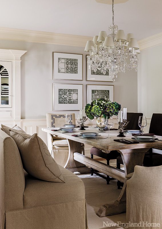Along with those practical finishes came beautiful furnishings and even a few antiques. A crystal chandelier hangs over the trestle table in the dining room, and a silver chain of embroidery dances across the slipcover of one of the chairs.