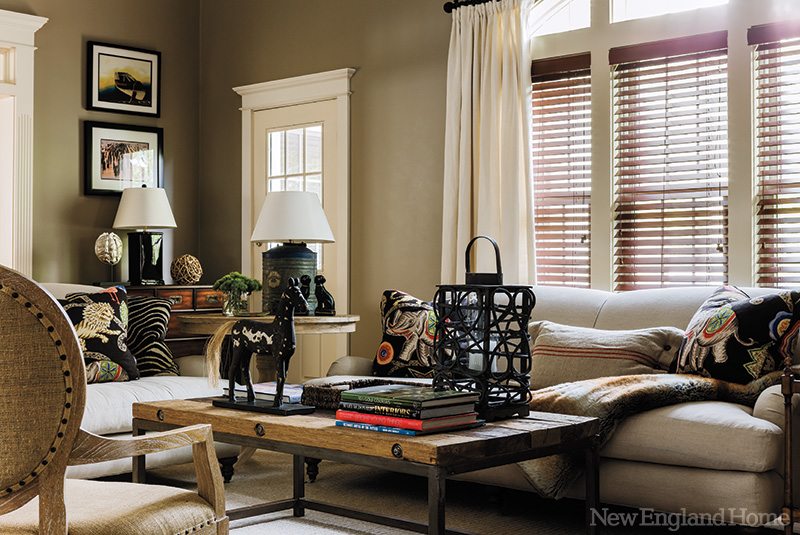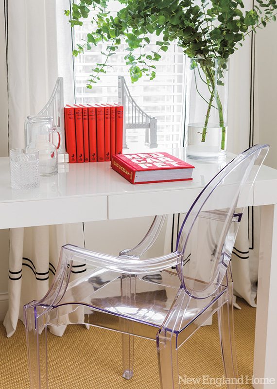 The interior architecture of the house (designed for a previous owner by Campbell Smith Architecture of nearby Duxbury) has a quietly traditional feel, with clean moldings and simple paneling throughout. This led the designers to a scheme that complements the home’s classic nature. “We focused on using lots of soft and friendly textures and contrast in the color and finishes rather than large amounts of printed fabrics,” says Hanlon MacQuarrie. “It’s a tailored interior that’s sophisticated enough for adults and yet perfectly practical for young, active boys.”