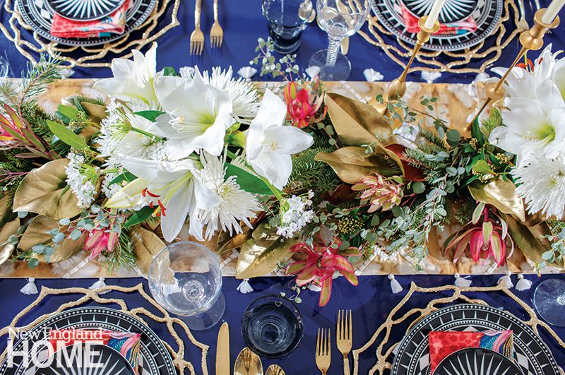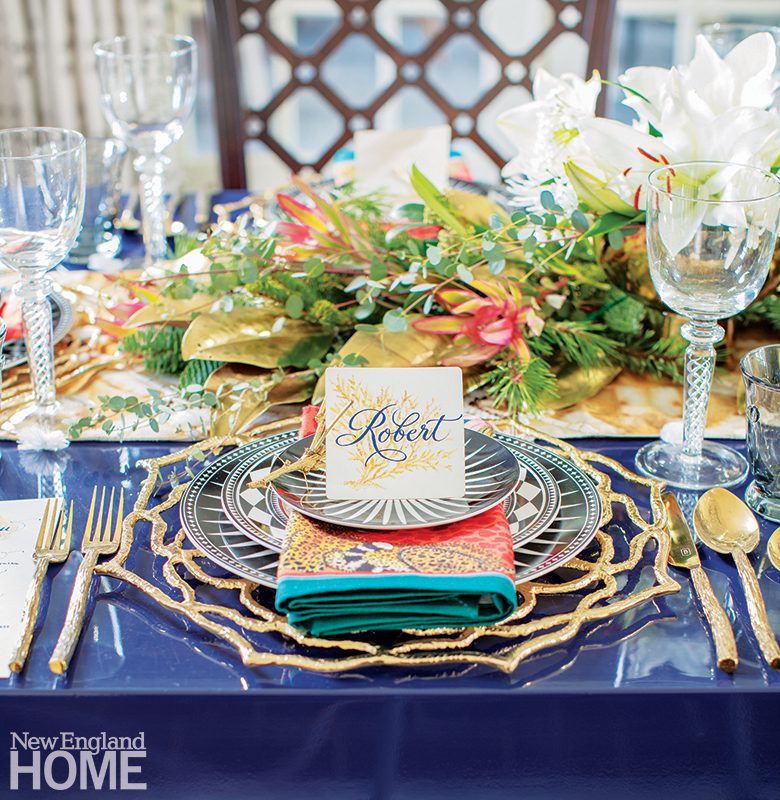 The table setting marries Moroccan flair with Old World glam and is suitable for an array of winter celebrations; the design reflects a more-is-more attitude and incorporates bold patterns and richly layered pieces sourced from local shops.