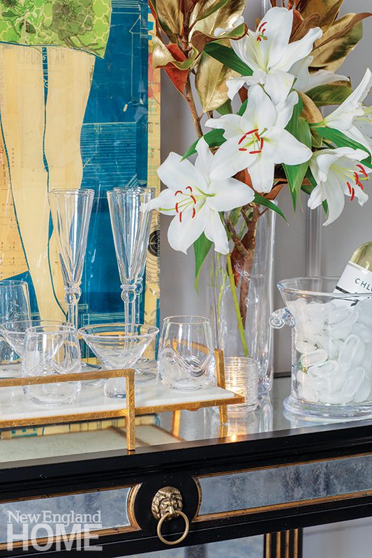 What better way to get back to entertaining than by hosting an intimate dinner party? An elegant dining room designed by Robin Gannon, principal of Robin Gannon Interiors, proves to be the perfect backdrop for an evening with friends. When it came to the room’s design, Gannon had a running start thanks to her client’s dining table, lacquered in a deep blueberry. The homeowner had seen a similar table in a magazine and had it recreated for her own home. Gannon’s goal was to ensure the personality-packed piece felt appropriate to the Georgian Colonial home. Classic furnishings, such as traditional dining chairs, an antique mirror, and a muted rug, quiet the room and add era-appropriate elegance.