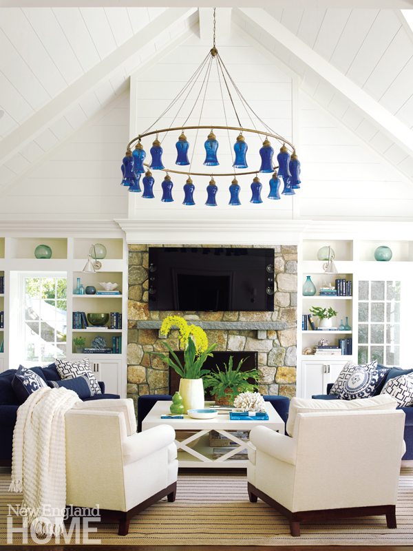 To that point, the family room’s jaw-dropping chandelier from Liza Sherman is posh, but not fussy. The hand-blown cobalt-blue shades stand in sharp relief against the white shiplap ceiling. Clustered about the stone hearth, there’s a bevy of inviting furnishings clad in durable fabrics that three teenagers and pets needn’t worry about. Blue is the thread that links the rooms, but taking a cue from the moody ocean, Morgan smartly varies the hues: the sofas are covered in a strong navy chenille from Duralee, for example, while the dining room chairs wear a soft green/blue Kravet Ultrasuede.