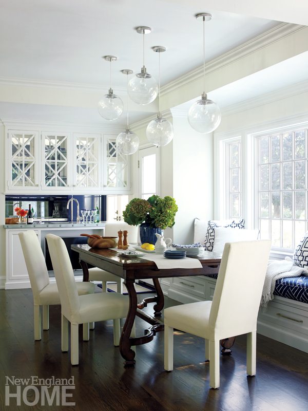 Stools by Palecek in the gleaming kitchen (which occupies basically the same location as the original cooking area) are also dressed in bold navy. Their nailhead trim speaks to the polished nickel pendants above the islands and zinc strapping on the custom hood. The top-notch, navy-lacquered bar sports a zinc countertop. West Elm globes sail aloft in the breakfast area. Even the cabinets dazzle. “That design just seemed right, and I liked the look,” says Brooks modestly of the glass doors with their stylish “X” detail.