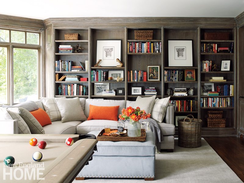 These days, if the kids have commandeered the family room for TV, the adults head to the cozy library. Conducive to reading, this “winter room,” as the designer refers to it, is also ideal for entertaining. Morgan elevated the space from vintage to chic by faux-painting the bookshelves to mimic limed oak. “It was an easy fix, but a huge transformation,” she says. Mitchell Gold + Bob Williams sectionals strewn with back-soothing pillows promote conversation, and there’s also a popular billiard table.