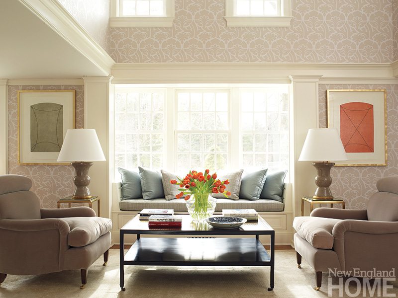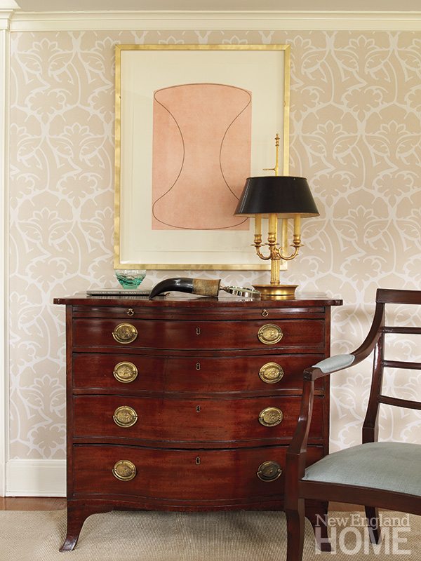 Slip into the lofty sitting room (an earlier tweak involved lifting the ceiling) and further examples abound of Roch and Chase’s talent for blending past and present. Since this space tends to be more about grown-ups, the designers helped the owners forge an inviting conversation area complete with cushioned window seat. Brass side tables and hand-crafted Christopher Spitzmiller ceramic lamps speak to today. So does the generous cocktail table, expansive enough to hold everyone’s drinks. No guest will ever find himself struggling to balance a wine glass in his lap while trying to snatch a canapé. The hospitable setting also holds a pedigreed chest from Woodbury’s Thomas Schwenke. Above it hangs a print—one of a series of four—by the American minimalist artist Robert Mangold. One might think a patterned backdrop would detract from Mangold’s work. On the contrary, the poetic paper, the same used in the dining room, counterbalances the cool art.