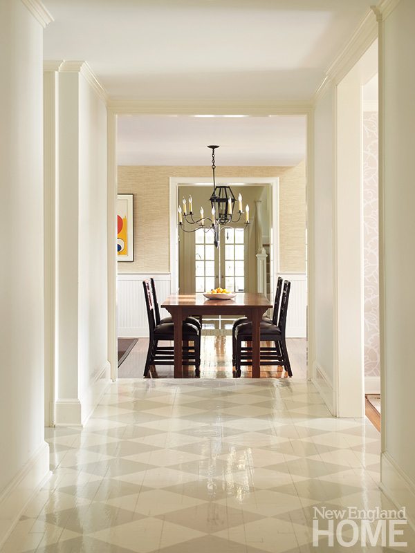 Moreover, by not confining themselves to any single period, the designers have conjured a fresh tone befitting a modern family. Off the hallway with its chic painted floor—the “spine of the old house,” as Chase labels it—sit the dining and sitting rooms. The latter could be interpreted as decidedly traditional with its antique sideboard and mirror, custom chandelier dripping prisms and Hepplewhite-style chairs. And what about the wallcovering? “The Kravet paper is reminiscent of damask but in a contemporary way,” Chase says.
