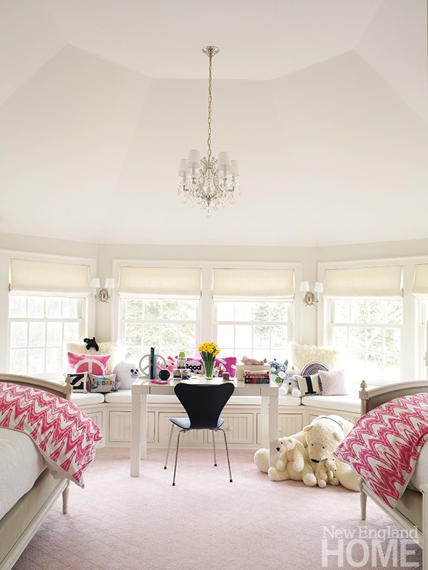The children’s quarters are adorable. Situated above the sun room, the daughter’s room’s hexagonal shape allows for a super-girly let’s-lounge-all-day window seat. Country Swedish beds upholstered in khaki twill will never seem age-inappropriate but instead can grow up with their owner. A simple Parsons table wedded to a Scandinavian chair is ideal for homework and diary writing.